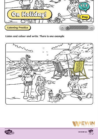 Flyers On Holiday! On Holiday! Prep Listening Practice Part 4 Listen and colour and write. There is one example. visit twinkl.com