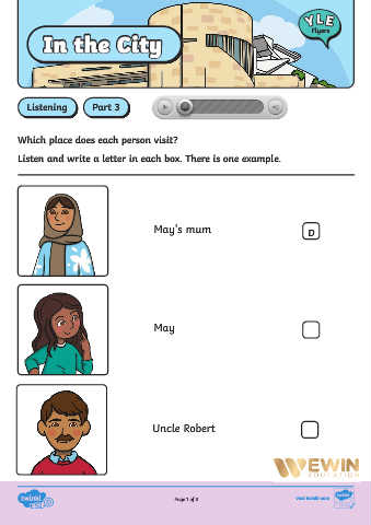In the City Flyers In the Cit y Listening Part 3 Which place does each person visit? Listen and write a letter in each box. There is one example. May's mum D May Uncle Robert Page 1 of 3 visit twinkl.com