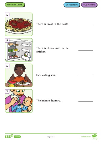 Food and Drink Vocabulary YLE Movers 4 There is meat in the pasta. 5 There is cheese next to the chicken. 6 He’s eating soup. 7 The baby is hungry. Page 5 of 8 visit twinkl.com