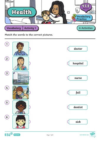 Health Movers Health A Vocabulary B Practice C Vocabulary Activity 1 6 Activities Match the words to the correct pictures. 1 doctor 2 hospital 3 nurse 4 fall 5 dentist 6 sick Page 1 of 8 visit twinkl.com