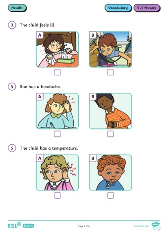 Health Vocabulary YLE Movers 3 The child feels ill. A B 4 She has a headache. A B 5 The child has a temperature. A B Page 6 of 8 visit twinkl.com