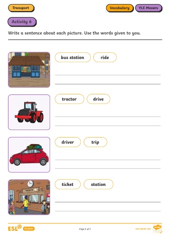 Transport Vocabulary YLE Movers Activity 6 Write a sentence about each picture. Use the words given to you. bus station ride tractor drive driver trip ticket station Page 8 of 9 visit twinkl.com