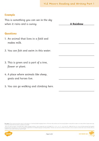 YLE Mo     v er s R eading and W         r iting P   ar  t 1
