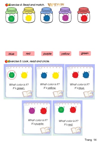 Exercise 4: Read and match. blue red purple yellow green Exercise 5: Look, read and circle. What color is it? What color is it? What color is it? It’s green. It’s yellow. It’s blue. What color is it? What color is it? It’s purple. It’s red. Trang 14
