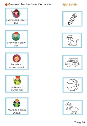 Exercise 4: Read and color then match. Lucy sees a yellow bus. Matt has a green ball. Anna has a brown pencil. Bella sees a purple cat. Nick has a black sheep. Trang 20