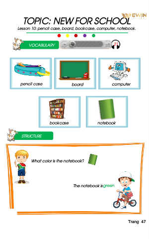 TOPIC: NEW FOR SCHOOL Lesson 10: pencil case, board, bookcase, computer, notebook. VOCABULARY Listen, point and say. 21 pencil case board computer bookcase notebook STRUCTURE What color is the notebook? The notebook is green. Trang 47