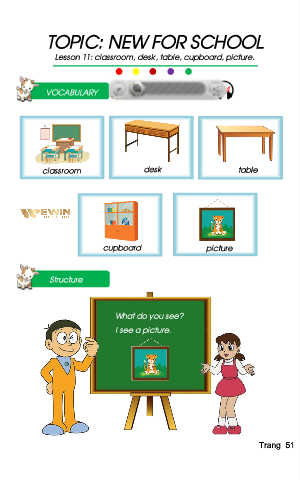 TOPIC: NEW FOR SCHOOL Lesson 11: classroom, desk, table, cupboard, picture. VOCABULARY Listen, point and say. 24 classroom desk table cupboard picture Structure What do you see? I see a picture. Trang 51