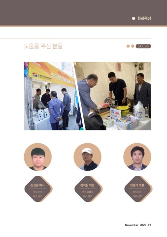 협회동정 도움을 주신 분들 10.16 조성관 이사 김지환 차장 양왕석 대표 광성상사 ㈜동영화성 이노에스 부스 상주 부스 상주 재료 찬조 November 2025 • 27