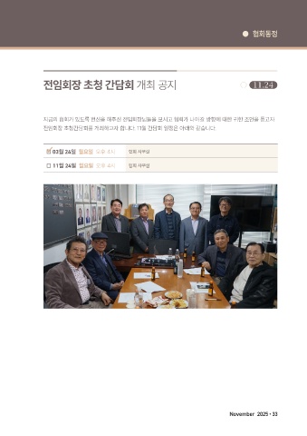 협회동정 전임회장 초청 간담회 개최 공지 11.24 지금의 협회가 있도록 헌신을 해주신 전임회장님들을 모시고 협회가 나아갈 방향에 대한 귀한 조언을 듣고자 전임회장 초청간담회를 개최하고자 합니다. 11월 간담회 일정은 아래와 같습니다. □ 03월 24일 월요일 오후 4시 협회 사무실 □ 11월 24일 월요일 오후 4시 협회 사무실 November 2025 • 33