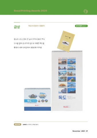 Seoul Printing Awards 2025 금상 독도의 풍경과 시 캘린더 문덕카렌다 김상만 동도와 서도 2개의 큰 섬과 주위의 89개 부속 도서를 합해 총 91개의 섬으로 이뤄진 독도를 풍경과 시로 디자인하여 캘린더로 제작함. 홍보인쇄 인쇄사양 HP 인디고 디지털 인쇄기 November 2025 • 39