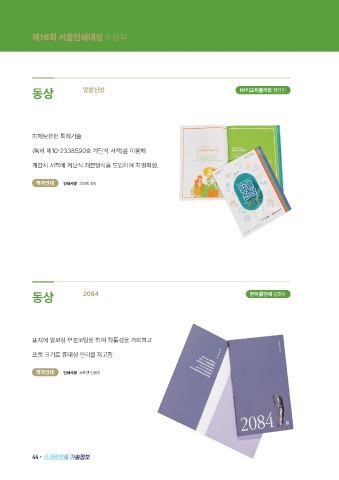 제16회 서울인쇄대상 수상작 동상 알쓸신상 ㈜티오피폴리컴 정찬민 자체보유한 특허기술 (특허 제10-2338590호 계단식 서적)을 이용해 계간지 서적에 계단식 제본방식을 도입하여 차별화함. 책자인쇄 인쇄사양 고모리 4색 동상 2084 한아름인쇄 김천수 표지에 엠보싱 부분코팅을 하여 작품성을 가미하고 포켓 크기로 휴대성 편리를 제고함. 책자인쇄 인쇄사양 오프셋 인쇄기 44 •