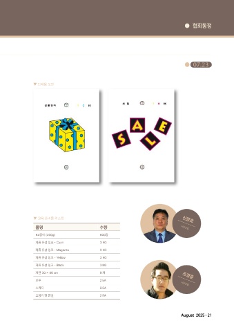 협회동정 07.23 ▼ 인쇄용 도안 ▼ 교육 준비물 리스트 신장호 품명 수량 서진산업 B4종이 (200g) 600장 지류 유성 잉크 - Cyan 3 KG 지류 유성 잉크 - Magenta 3 KG 지류 유성 잉크 - Yellow 3 KG 지류 유성 잉크 - Black 3 KG 제판 30 x 40 cm 9 개 조경훈 보루 2 EA 서진산업 스퀴지 9 EA 고정기 및 판넬 2 EA August 2025 • 21