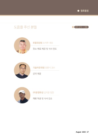 협회동정 도움을 주신 분들 07.25 – 26 토탈프린팅 조석호 대표 장소•재료 제공 및 식사 찬조 기술자문위원 정명식 교수 강의 제공 ㈜동영화성 김지환 팀장 재료 제공 및 식사 찬조 August 2025 • 27