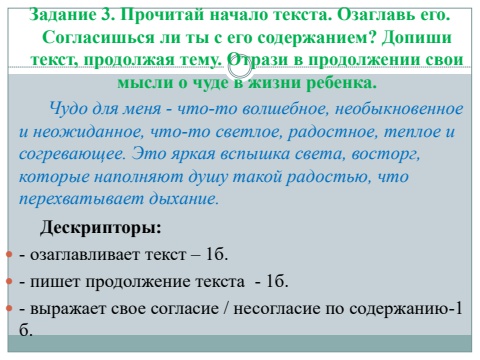 %u0417%u0430%u0434%u0430%u043d%u0438%u0435 3. %u041f%u0440%u043e%u0447%u0438%u0442%u0430%u0439 %u043d%u0430%u0447%u0430%u043b%u043e %u0442%u0435%u043a%u0441%u0442%u0430. %u041e%u0437%u0430%u0433%u043b%u0430%u0432%u044c %u0435%u0433%u043e. %u0421%u043e%u0433%u043b%u0430%u0441%u0438%u0448%u044c%u0441%u044f %u043b%u0438 %u0442%u044b %u0441 %u0435%u0433%u043e %u0441%u043e%u0434%u0435%u0440%u0436%u0430%u043d%u0438%u0435%u043c? %u0414%u043e%u043f%u0438%u0448%u0438 %u0442%u0435%u043a%u0441%u0442, %u043f%u0440%u043e%u0434%u043e%u043b%u0436%u0430%u044f %u0442%u0435%u043c%u0443. %u041e%u0442%u0440%u0430%u0437%u0438 %u0432 %u043f%u0440%u043e%u0434%u043e%u043b%u0436%u0435%u043d%u0438%u0438 %u0441%u0432%u043e%u0438 %u043c%u044b%u0441%u043b%u0438 %u043e %u0447%u0443%u0434%u0435 %u0432 %u0436%u0438%u0437%u043d%u0438 %u0440%u0435%u0431%u0435%u043d%u043a%u0430.%u0427%u0443%u0434%u043e %u0434%u043b%u044f %u043c%u0435%u043d%u044f - %u0447%u0442%u043e-%u0442%u043e %u0432%u043e%u043b%u0448%u0435%u0431%u043d%u043e%u0435, %u043d%u0435%u043e%u0431%u044b%u043a%u043d%u043e%u0432%u0435%u043d%u043d%u043e%u0435 %u0438 %u043d%u0435%u043e%u0436%u0438%u0434%u0430%u043d%u043d%u043e%u0435, %u0447%u0442%u043e-%u0442%u043e %u0441%u0432%u0435%u0442%u043b%u043e%u0435, %u0440%u0430%u0434%u043e%u0441%u0442%u043d%u043e%u0435, %u0442%u0435%u043f%u043b%u043e%u0435 %u0438 %u0441%u043e%u0433%u0440%u0435%u0432%u0430%u044e%u0449%u0435%u0435. %u042d%u0442%u043e %u044f%u0440%u043a%u0430%u044f %u0432%u0441%u043f%u044b%u0448%u043a%u0430 %u0441%u0432%u0435%u0442%u0430, %u0432%u043e%u0441%u0442%u043e%u0440%u0433, %u043a%u043e%u0442%u043e%u0440%u044b%u0435 %u043d%u0430%u043f%u043e%u043b%u043d%u044f%u044e%u0442 %u0434%u0443%u0448%u0443 %u0442%u0430%u043a%u043e%u0439 %u0440%u0430%u0434%u043e%u0441%u0442%u044c%u044e, %u0447%u0442%u043e %u043f%u0435%u0440%u0435%u0445%u0432%u0430%u0442%u044b%u0432%u0430%u0435%u0442 %u0434%u044b%u0445%u0430%u043d%u0438%u0435.%u0414%u0435%u0441%u043a%u0440%u0438%u043f%u0442%u043e%u0440%u044b:%uf097 - %u043e%u0437%u0430%u0433%u043b%u0430%u0432%u043b%u0438%u0432%u0430%u0435%u0442 %u0442%u0435%u043a%u0441%u0442 %u2013 1%u0431.%uf097 - %u043f%u0438%u0448%u0435%u0442 %u043f%u0440%u043e%u0434%u043e%u043b%u0436%u0435%u043d%u0438%u0435 %u0442%u0435%u043a%u0441%u0442%u0430 - 1%u0431.%uf097 - %u0432%u044b%u0440%u0430%u0436%u0430%u0435%u0442 %u0441%u0432%u043e%u0435 %u0441%u043e%u0433%u043b%u0430%u0441%u0438%u0435 / %u043d%u0435%u0441%u043e%u0433%u043b%u0430%u0441%u0438%u0435 %u043f%u043e %u0441%u043e%u0434%u0435%u0440%u0436%u0430%u043d%u0438%u044e-1 %u0431.