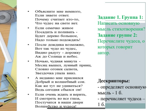 %u0417%u0430%u0434%u0430%u043d%u0438%u0435 1. %u0413%u0440%u0443%u043f%u043f%u0430 1:%u041d%u0430%u043f%u0438%u0441%u0430%u0442%u044c %u043e%u0441%u043d%u043e%u0432%u043d%u0443%u044e %u043c%u044b%u0441%u043b%u044c %u0441%u0442%u0438%u0445%u043e%u0442%u0432%u043e%u0440%u0435%u043d%u0438%u044f? %u0417%u0430%u0434%u0430%u043d%u0438%u0435 %u0433%u0440%u0443%u043f%u043f%u0435 2:%u041f%u0435%u0440%u0435%u0447%u0438%u0441%u043b%u0438%u0442%u0435 %u0447%u0443%u0434%u0435%u0441%u0430, %u043e %u043a%u043e%u0442%u043e%u0440%u044b%u0445 %u0433%u043e%u0432%u043e%u0440%u0438%u0442 %u0430%u0432%u0442%u043e%u0440.%u0414%u0435%u0441%u043a%u0440%u0438%u043f%u0442%u043e%u0440%u044b:- %u043e%u043f%u0440%u0435%u0434%u0435%u043b%u044f%u0435%u0442 %u043e%u0441%u043d%u043e%u0432%u043d%u0443%u044e %u043c%u044b%u0441%u043b%u044c - 1 %u0431.- %u043f%u0435%u0440%u0435%u0447%u0438%u0441%u043b%u044f%u0435%u0442 %u0447%u0443%u0434%u0435%u0441%u0430 %u20131 %u0431.