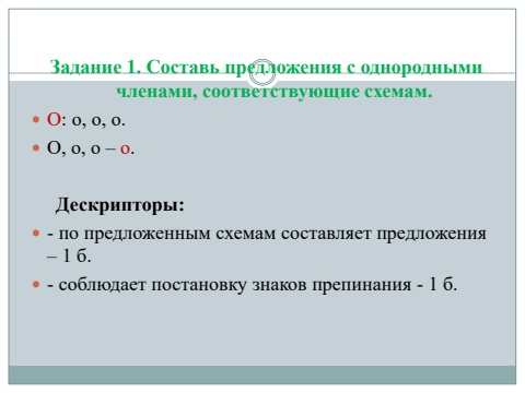 %u0417%u0430%u0434%u0430%u043d%u0438%u0435 1. %u0421%u043e%u0441%u0442%u0430%u0432%u044c %u043f%u0440%u0435%u0434%u043b%u043e%u0436%u0435%u043d%u0438%u044f %u0441 %u043e%u0434%u043d%u043e%u0440%u043e%u0434%u043d%u044b%u043c%u0438 %u0447%u043b%u0435%u043d%u0430%u043c%u0438, %u0441%u043e%u043e%u0442%u0432%u0435%u0442%u0441%u0442%u0432%u0443%u044e%u0449%u0438%u0435 %u0441%u0445%u0435%u043c%u0430%u043c. %uf097 %u041e: %u043e, %u043e, %u043e.%uf097 %u041e, %u043e, %u043e %u2013 %u043e.%u0414%u0435%u0441%u043a%u0440%u0438%u043f%u0442%u043e%u0440%u044b:%uf097 - %u043f%u043e %u043f%u0440%u0435%u0434%u043b%u043e%u0436%u0435%u043d%u043d%u044b%u043c %u0441%u0445%u0435%u043c%u0430%u043c %u0441%u043e%u0441%u0442%u0430%u0432%u043b%u044f%u0435%u0442 %u043f%u0440%u0435%u0434%u043b%u043e%u0436%u0435%u043d%u0438%u044f %u2013 1 %u0431. %uf097 - %u0441%u043e%u0431%u043b%u044e%u0434%u0430%u0435%u0442 %u043f%u043e%u0441%u0442%u0430%u043d%u043e%u0432%u043a%u0443 %u0437%u043d%u0430%u043a%u043e%u0432 %u043f%u0440%u0435%u043f%u0438%u043d%u0430%u043d%u0438%u044f - 1 %u0431.