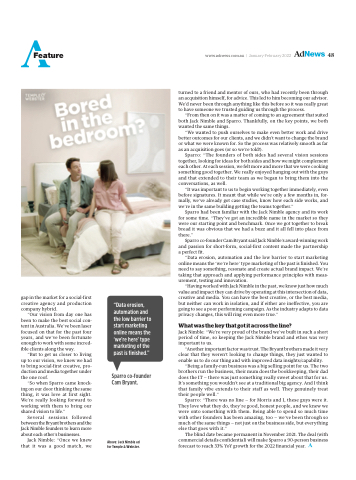 “Data erosion, automation and the low barrier to start marketing online means the ‘we’re here’ type marketing of the past is finished. You need to say something, resonate and create actual brand impact. We’re taking that approach and applying performance principles with meas- urement, testing and innovation.