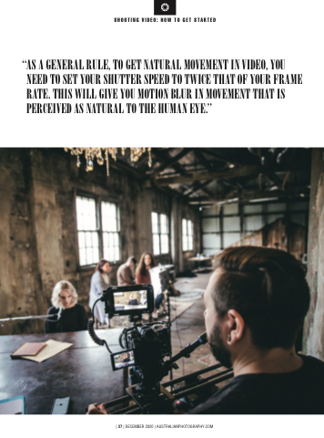 “AS A GENERAL RULE, TO GET NATURAL MOVEMENT IN VIDEO, YOU NEED TO SET YOUR SHUTTER SPEED TO TWICE THAT OF YOUR FRAME RATE. THIS WILL GIVE YOU MOTION BLUR IN MOVEMENT THAT IS PERCEIVED AS NATURAL TO THE HUMAN EYE.”