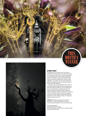 The Milky Way was directly above in the southern hemisphere so Andrew Healey “was racking my brain to find a foreground with interest. I found a dead gumtree in my backyard and after a few different composition attempts I fluked this one which looked like the dead branch was holding the Milky Way in its hand. Death holding life, so to speak. This is my second season of Milky Way photography and trying to think outside the square is quite the challenge.”