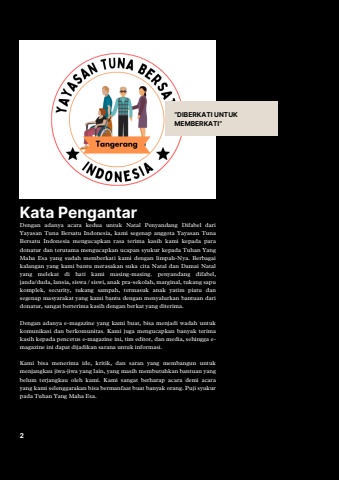 KataPengantarDenganadanyaacarakeduauntukNatalPenyandangDifabeldariYayasanTunaBersatuIndonesia,kamisegenapanggotaYayasanTunaBersatuIndonesiamengucapkanrasaterimakasihkamikepadaparadonaturdanterutamamengucapkanucapansyukurkepadaTuhanYangMahaEsayangsudahmemberkatikamidenganlimpah-Nya.BerbagaikalanganyangkamibantumerasakansukacitaNataldanDamaiNatalyangmelekatdihatikamimasing-masing.penyandangdifabel,janda/duda,lansia,siswa/siswi,anakpra-sekolah,marginal,tukangsapukomplek,security,tukangsampah,termasukanakyatimpiatudansegenapmasyarakatyangkamibantudenganmenyalurkanbantuandaridonatur,sangatberterimakasihdenganberkatyangditerima.Denganadanyae-magazineyangkamibuat,bisamenjadiwadahuntukkomunikasidanberkomunitas.Kamijugamengucapkanbanyakterimakasihkepadapencetuse-magazineini,timeditor,danmedia,sehinggaemagazineinidapatdijadikansaranauntukinformasi.Kamibisamenerimaide,kritik,dansaranyangmembangununtukmenjangkaujiwa-jiwayanglain,yangmasihmembutuhkanbantuanyangbelumterjangkauolehkami.Kamisangatberharapacarademiacarayangkamiselenggarakanbisabermanfaatbuatbanyakorang.PujisyukurpadaTuhanYangMahaEsa.%u201cDIBERKATIUNTUKMEMBERKATI%u201d2