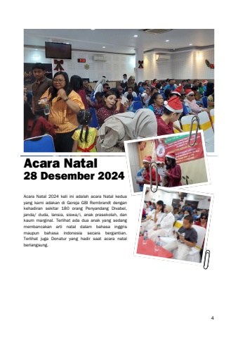 AcaraNatalesemerAcaraNatal2024kaliiniadalahacaraNatalkeduyangkamiadakandiGerejaGBIRembrandtdengankehadiransekitar180orangPenyandangDivabel,janda/duda,lansia,siswa/i,anakprasekoah,dankaummarginal.Terlihatadaduaanakyangsedangmembancakanartinataldalambahasainggrismaupunbahasaindonesiasecarabergantan.TerlihatjugaDonaturyanghadirsaatacaranatalberlangsung.