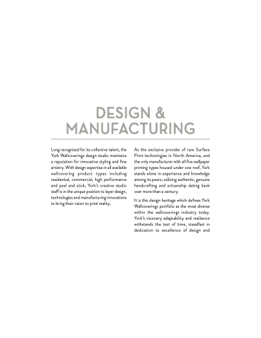 As the exclusive provider of rare Surface Print technologies in North America, and the only manufacturer with all five wallpaper printing types housed under one roof, York stands alone in experience and knowledge among its peers; utilizing authentic, genuine handcrafting and artisanship dating back over more than a century.