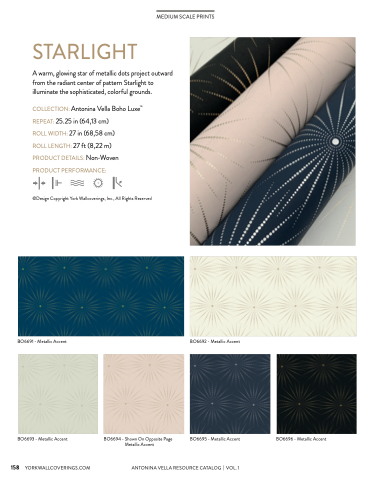 A warm, glowing star of metallic dots project outward from the radiant center of pattern Starlight to illuminate the sophisticated, colorful grounds.