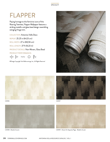 Paying homage to the feminine icons of the Roaring Twenties, Flapper Wallpaper features a striking metallic and glass bead design resembling swinging fringe trim.