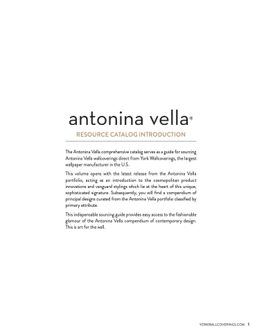 The Antonina Vella comprehensive catalog serves as a guide for sourcing Antonina Vella wallcoverings direct from York Wallcoverings, the largest wallpaper manufacturer in the U.S.