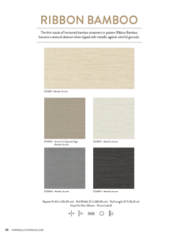 The thin stacks of horizontal bamboo streamers in pattern Ribbon Bamboo become a textural abstract when tipped with metallic against colorful grounds.