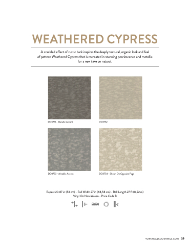 A crackled effect of rustic bark inspires the deeply textural, organic look and feel of pattern Weathered Cypress that is recreated in stunning pearlescence and metallic for a new take on natural.