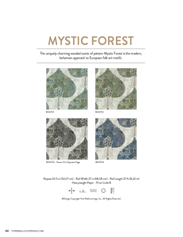 The uniquely charming wooded scenic of pattern Mystic Forest is the modern, bohemian approach to European folk-art motifs.