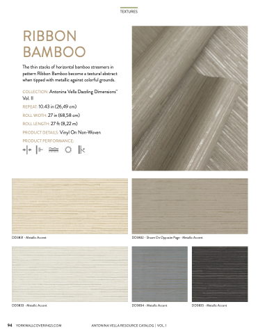 The thin stacks of horizontal bamboo streamers in pattern Ribbon Bamboo become a textural abstract when tipped with metallic against colorful grounds.