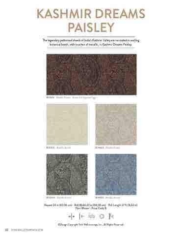 The legendary patterned shawls of India’s Kashmir Valley are recreated in swirling botanical boteh, with touches of metallic, in Kashmir Dreams Paisley.