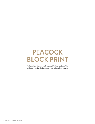 PEACOCK BLOCK PRINT The beautiful artisan bird and branch motif of Peacock Block Print replicates a hand applied pattern on a sophisticated linen ground. 6 YORKWALLCOVERINGS.COM