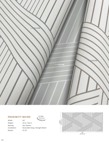 TFC1785 TFC1786 TFC1787 61 PROXIMITY MICRO Width: Weight: Backing: Installation: Repeat: 54" 20 oz. Type II Non-Woven Reversible Hang / Straight Match 25.25" 54" (137,16 cm) 25.25" (64,135 cm)