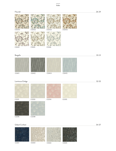 Flourish 26-29 CN2100 CN2102 CI2424 CI2425 Bargello CN2103 CI2426 CN2105 Index 30-31 CI2401 Luminous Ginkgo CI2402 CI2404 CI2405 32-33 CI2331 CI2333 CI2334 CI2335 CI2336 Gilded Confetti CI2338 34-37 CI2321 CI2323 CI2324 CI2325