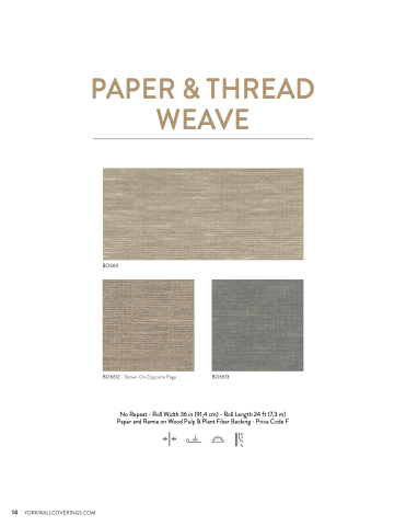 PAPER & THREAD WEAVE BO6611 BO6612 - Shown On Opposite Page BO6613 No Repeat - Roll Width 36 in (91,4 cm) - Roll Length 24 ft (7,3 m) Paper and Ramie on Wood Pulp & Plant Fiber Backing - Price Code F 14 YORKWALLCOVERINGS.COM