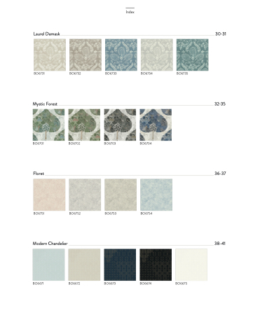Laurel Damask BO6731 Mystic Forest BO6701 Floret BO6751 Modern Chandelier BO6671 30-31 BO6732 BO6733 BO6734 BO6735 Index 32-35 BO6702 BO6703 BO6704 BO6752 BO6753 BO6754 36-37 38-41 BO6672 BO6673 BO6674 BO6675
