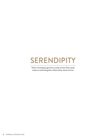 SERENDIPITY Pattern Serendipity’s geometric overlap of linear flower petals creates an interlocking dance influenced by natural sciences. 6 YORKWALLCOVERINGS.COM