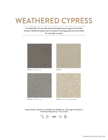 A crackled effect of rustic bark inspires the deeply textural, organic look and feel of pattern Weathered Cypress that is recreated in stunning pearlescence and metallic for a new take on natural.