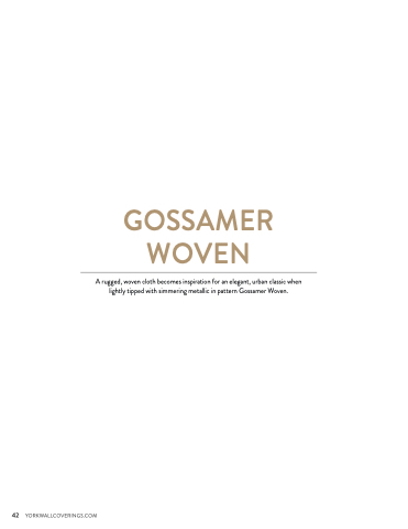 GOSSAMER WOVEN A rugged, woven cloth becomes inspiration for an elegant, urban classic when lightly tipped with simmering metallic in pattern Gossamer Woven. 42 YORKWALLCOVERINGS.COM