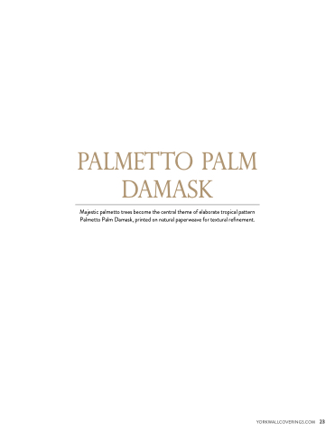 palmetto palm damask Majestic palmetto trees become the central theme of elaborate tropical pattern Palmetto Palm Damask, printed on natural paperweave for textural refinement. YORKWALLCOVERINGS.COM 23