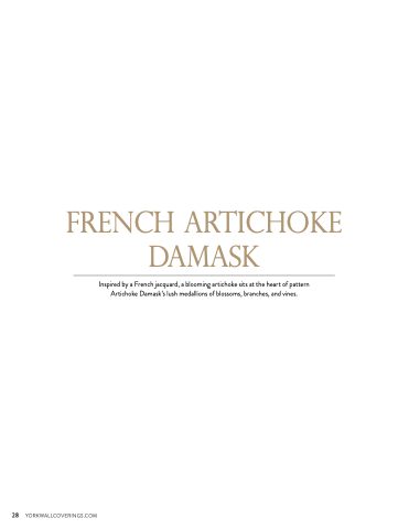 french artichoke damask Inspired by a French jacquard, a blooming artichoke sits at the heart of pattern Artichoke Damask’s lush medallions of blossoms, branches, and vines. 28 YORKWALLCOVERINGS.COM
