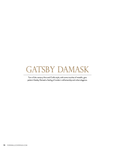 gatsby damask Turn of the century Arts and Crafts style, with some touches of metallic, give pattern Gatsby Damask a feeling of modern craftsmanship and urban elegance. 36 YORKWALLCOVERINGS.COM