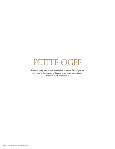 petite ogee The small, sumptuous, botanical medallions of pattern Petite Ogee are embraced by linear curves to shape an allover classic damask print, modernized with raised texture. 44 YORKWALLCOVERINGS.COM