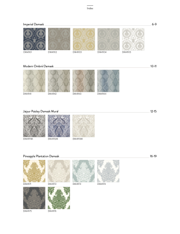 Imperial Damask DM4901 DM4902 Modern Ombré Damask DM4941 DM4942 Jaipur Paisley Damask Mural DM4911M DM4912M Pineapple Plantation Damask DM4971 DM4972 DM4975 DM4976 6-9 DM4903 DM4904 DM4905 DM4913M Index 10-11 DM4943 DM4944 12-15 16-19 DM4973 DM4974