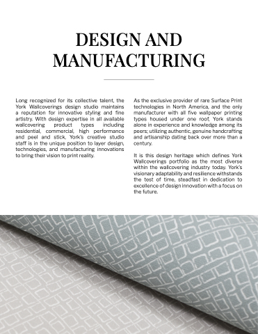 It is this design heritage which defines York Wallcoverings portfolio as the most diverse within the wallcovering industry today. York's visionary adaptability and resilience withstands the test of time, steadfast in dedication to excellence of design innovation with a focus on the future.