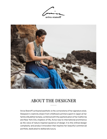 Aviva Stanoff’s artisanal aesthetic is the cornerstone of her signature style. Steeped in creativity drawn from childhood summers spent in Japan at her family’s Buddhist temple, combined with the sophistication of her California and New York City chapters of life, Aviva rose to international prominence as the voice of nature inspired opulence of design. It is this refined design complexity and product innovation that inspires her beautiful commercial portfolio, dedicated to deliberate luxury.