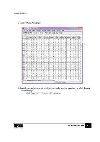 Hetrokedasitas c. Entry Data Penelitian d. Lakukan analisis correlate bivariate, pada masing-masing variabel dengan indikatornya. 1) click Analyze>> Correlate>>Bivariate APLIKASI KOMPUTER 87